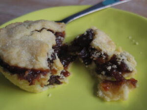 明日からのメニュー、ミンスパイ。これは昨日の発送分で余分に焼いたやつを今日のおやつに。外側のペストリー生地は、バターと粉と水で作るイギリスのクラッシックなもの。砂糖もほとんど入らないので、焼き色が着きにくいのですが、ほろほろと崩れる食感が特徴です。