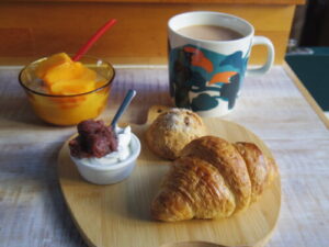 ameen’s ovenのクロワッサン、カフェで余ったスコーン、柿ヨーグルト。
