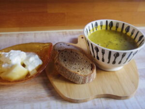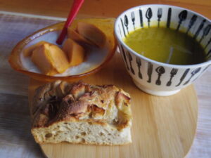 YENTAのジャガイモフォカッチャ、かぼちゃと人参のポタージュ、柿ヨーグルト。鶏ガラをストーブの上でコトコト煮て作ったチキンストックを使うと、美味しいスープが手軽に出来るので、冬の間は自家製ストックをせっせと冷凍しておくのです。