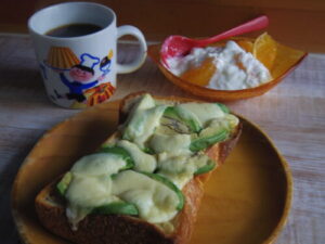 YENTAのパンドミでアボカドチーズトースト、柿ヨーグルト。
