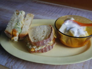 ameen’s ovenのパンでポテトサラダサンド、洋梨ヨーグルト。