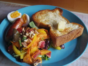 YENTAのパンドミでバタートースト、茹で卵、サラダ、焼きソーセージ。