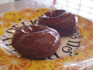 チョコレートドーナツはチョコチップ入りのチョコレート生地に最後、チョコレートをかけて仕上げました。味見して美味しかったので販売しました。