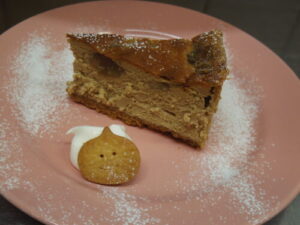 コーヒーマロンチーズケーキは、コーヒーのほろ苦さを加えたサワークリームたっぷりのリッチなベイクドチーズケーキ生地に、マロングラッセの餡を合わせました。マロングラッセの甘さとコーヒーのほろ苦さが良く合います。