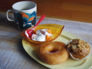 カフェで余ったマフィン、ドーナツ、柿ヨーグルト。