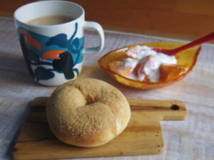 ベーグルとベイク月のこしあんクルミベーグル、柿ヨーグルト。