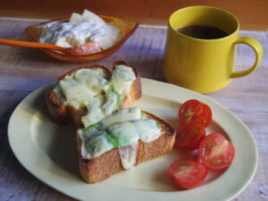 YENTAのパンドミでアボカドチーズトースト、プチトマト、洋梨ヨーグルト。