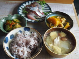 雑穀ご飯、いさきの刺身、キュウリのピリ辛和え、かぼちゃそぼろ煮、みそ汁。かぼちゃのそぼろ煮、大当たりのカボチャで嬉しい。大好物なのに、イマイチ味が決まらなかったのが、白ご飯.comのレシピで作るようにしてから、バッチリ。