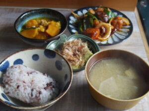 雑穀ご飯、鶏と野菜の甘酢炒め、焼き茄子、かぼちゃそぼろ煮、みそ汁。
