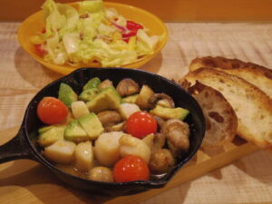 アヒージョ、サラダ、カノアベーカリーのカンパーニュの端っこ。アヒージョの具は、ホタテ、アボカド、マッシュルーム、プチトマト。