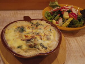 マカロニグラタン、サラダ。グラタンの具は、ベーコン、玉ねぎ、椎茸、ホウレンソウ。サラダの具は、サニーレタス、ラディッシュ、黄パプリカ、トマト、林檎、クルミ。