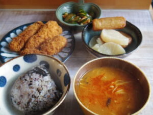 雑穀ご飯、牡蠣フライ、鯖フライ、大根と練り物の炊いたん、キュウリのピリ辛和え、キムチチゲ。牡蠣フライと鯖フライは冷凍の衣ついてるやつを、ドーナツで使ったココナッツオイルで揚げた。