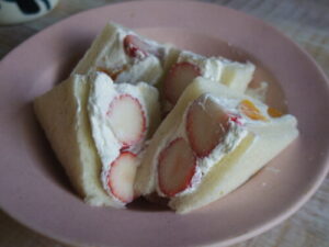おうちパンの食パンでフルーツサンド。苺と伊予柑使って、水切りヨーグルトと生クリームを合わせたクリームで。サンドしてからのカットがいつもめちゃくちゃ手こずる。