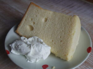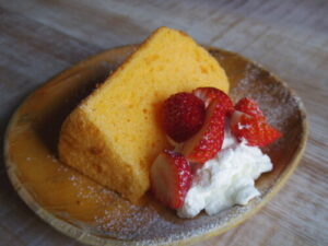 パティスリーミムラのシフォンケーキ。苺と生クリーム添えて。こちらのシフォンケーキ、価格も手ごろで美味しいです。