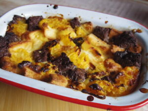 フルーツサンドで切り落した食パンの端っこと、カフェで余ったブラウニーと伊予柑を使ったブレッドプディング。余ったブラウニー入れるの、凄い良かった。