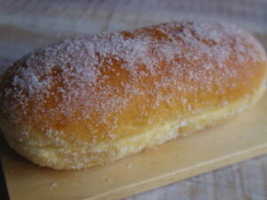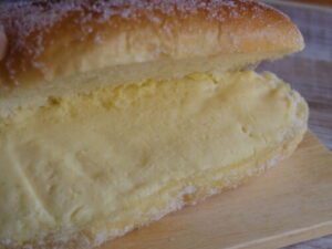ぱんの田島で揚げパンのシュガー&カスタード。私の通っていた小学校では、給食に揚げパンは出なかったので、懐かしいなーという感想は無いのですが、カスタードを挟んであるやつは、ちょっと食べてみたい、という事で。
