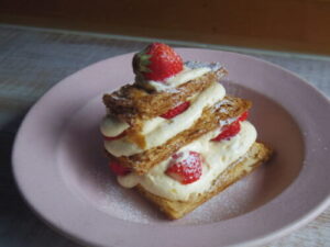 カフェで余ったメニューで、大喜びのスペシャル苺のミルフィーユ。カフェで出してるやつより1段多いので、スペシャル。美味しくて幸せー。