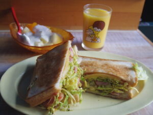 おうちパンの食パンでホットサンド、洋梨ヨーグルト。サンドの具は、キャベツとレモンソーセージ、チーズ。オレンジジュースも久々に。