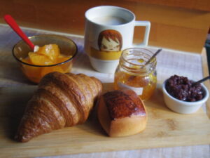 おうちパンのクロワッサンとミルクパン、オレンジヨーグルト。自家製の粒あんとウィスキーマーマレードを添えて、飲み物はカフェラテ。おうちパンのミルクパンは初めてだったけど、美味しかったのでまた買うと思う。