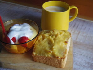 カスタードトースト、苺オレンジヨーグルト。