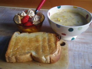 sloの山食でバタートースト、野菜スープ、苺メレンゲヨーグルト。野菜スープは、牛乳を入れてちょっと味変。