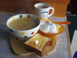 and breadの角食でバタートースト、野菜スープ、洋梨ヨーグルト。