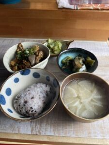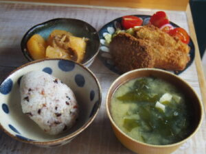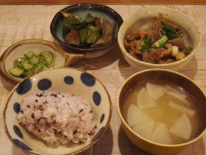 雑穀ご飯、牛筋煮(こんにゃく入り)、茄子とピーマンの煮びたし、キュウリの酢の物、みそ汁。