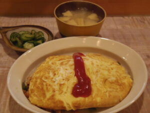 オムライス、キュウリの酢の物、みそ汁。オムライスの卵はエダムチーズ入り。