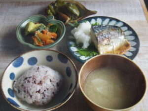 雑穀ご飯、焼き鯖、茄子とピーマンの煮びたし、キュウリのキムチ和え、みそ汁。きゅりのキムチ和えは、塩もみした大き目に切ったキュウリとキムチを和えて、ゴマ油と胡麻をかけたものだけど、ゴマ油が良い仕事してて美味しかった。
