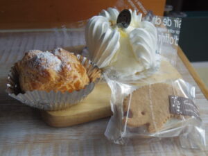 まだこんなに暑くなかった時期、中立売通りのメゾンドガトーでケーキ初めて買ってみた。シュークリームとメレンゲのお菓子とレーズンバターサンド。
