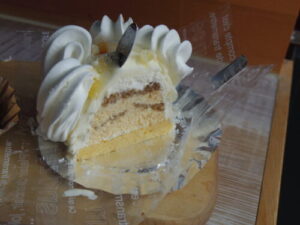 メレンゲのお菓子は、中はティラミス味のケーキでバタークリームで覆ってあって、まわりをメレンゲで飾ってあるお菓子。