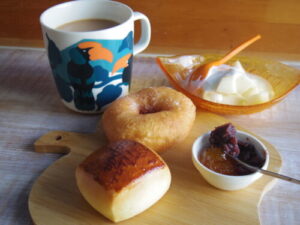 おうちパンのミルクパンにウィスキーマーマレードと自家製粒あん、カフェで余ったドーナツ、洋梨ヨーグルト。ウィスキーマーマレードと粒あんの組み合わせが凄い好きで、めっちゃ食べてる。