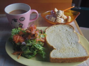 Sloのカンパーニュでアボカドチーズケーキ、サラダ、洋梨ヨーグルト。サラダはトマトとキャロットラぺ。