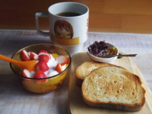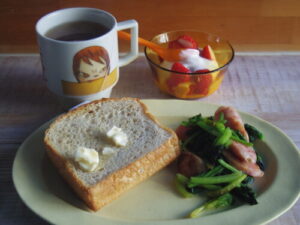 kursのパンドミでバタートースト、ほうれん草とソーセージ炒め、苺オレンジヨーグルト。