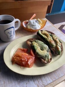 Sloの山食でバタートースト、サラダ、苺メレンゲヨーグルト。トースターの調子が悪くてパンの色づきが悪いけど、この山食もめっちゃ美味しかった。Sloのパン、美味しくてまた買いたいけど、なかなか営業日と私の行ける日がかぶらない。