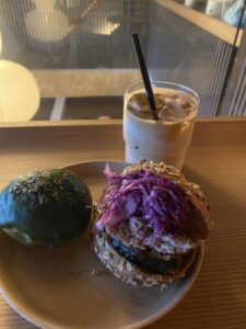 2階のイートインで食べたのはダコタンバーガーと抹茶のパンとアイスカフェラテ。パンを温めて貰えるシステムが良くわからなかったので、冷たいまま食べたけど、バーガーは多分温めて貰った方が美味しいと思う。