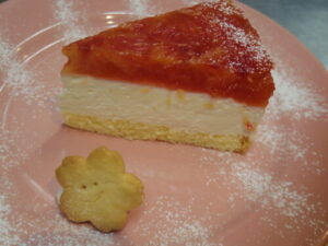ブラッドオレンジのレアチーズケーキ。綺麗な色です。ケーキに添えた桜の花の形のクッキーは、短い期間だけ登場します。小学校の時のよくできましたハンコを思い出す可愛さで気に入ってます。