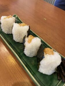 そして、もう一つの名物は天むす。オーダーしてからえび天揚げてくれるので、サックサクで、ご飯も温かくてめちゃくちゃ美味しかった。3つで一皿なのを、2人で食べるので4個で作って下さいました。夜は飲み屋さんだけど、14時から営業なので、飲まない私も行きやすくて嬉しい。