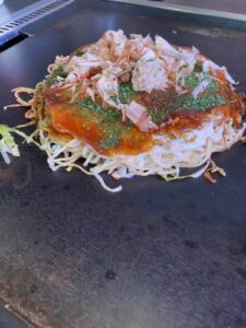 豚イカ天そばのお好み焼き。店主さんが焼いたのを鉄板の上に持ってきてくださいます。時間かけて丁寧に焼いて下さって、お昼に行ったのだけど、急いでる人は電話しておくのが良いのかもしれないけど、丁寧に作ってもらってる贅沢さありました。また行きたいなーっと思うお店でした。