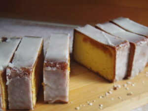 金柑パンドジェーヌは、パウンド型で焼きました。ウィスキーアイシングで仕上げました。アーモンドたっぷりの生地がジュワっとして、ほろ苦いウィスキーアイシングと金柑のコンポートが良く合います。キンキンに冷やしても美味しいです。