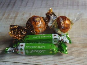 リンツのリンドールは、ノッチョカフェっていうコーヒーとヘーゼルナッツのやつと、ドルセデレチェ、バトンのはミルク&シリアル。四条のリンツ、たまに行って選んで買うの、楽しいのよねー。試食貰ってうふふーっとなりながらお目当てのを買う。
