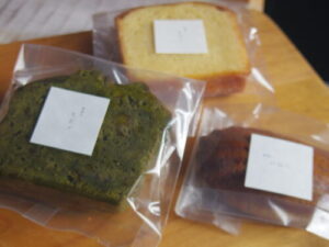 カシエの焼き菓子。塩バニラケーキ、抹茶とクルミのケーキ、烏龍茶マドレーヌ。