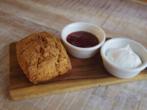 sloのスコーンに試作ジャムとクリームで。かなり粉が全面に出るスコーン。バター感よりも全粒粉の香ばしいざっくり感。どっしりしてるので、朝ごはん向きだったかも。