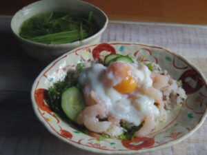 甘エビの塩辛丼、三つ葉の澄まし汁。
