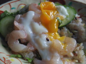 スーパーの出店で甘エビの塩辛を奮発して購入。茗荷と大葉を混ぜたご飯の上にどどーーんっと乗せて、温泉卵もオン。めっちゃ美味しかった!お刺身用の甘エビ買って、塩麹に漬けたら自作出来そうな気がするので今度やってみよう。