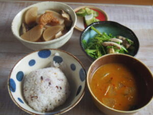 雑穀ご飯、大根とさつま揚げと椎茸の炊いたん、鶏とセリの和え物、浅漬け、キムチチゲ。セリがめちゃくちゃ安かったので、茹でた鶏と和え物にした。三つ葉やセリが安いとついつい買ってしまう。