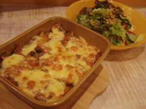 ペンネグラタン、サラダ。作り置きのミートソースで簡単に。