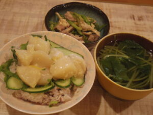 ホタテの柚子塩麹漬け丼、セリと鶏肉の和え物、三つ葉の澄まし汁。甘エビの塩辛丼が美味しすぎて、塩麹で漬け込んだら同じ感じでいけるのでは?とお刺身でもいける冷凍のホタテを使って自家製柚子塩麹で漬け込んでみたけど、めっちゃ良い感じだった。