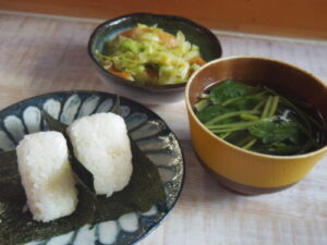 ツナマヨお握り、春キャベツとさつま揚げの炊いたん、三つ葉の澄まし汁。お握りがめちゃくちゃ美味しかった。海苔大事。久々に白米を炊いたのでした。
