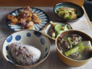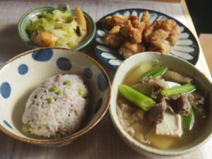 雑穀豆ごはん、から揚げ、春キャベツとさつま揚げの炊いたん、肉吸い。
